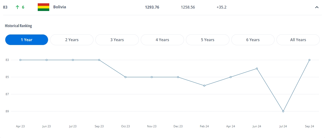 足坛汇09月19日讯 FIFA最新一期国家队排名公布,玻利维亚积分暴涨35.2分,世界排名上升6位至第83,但在南美仍垫底。