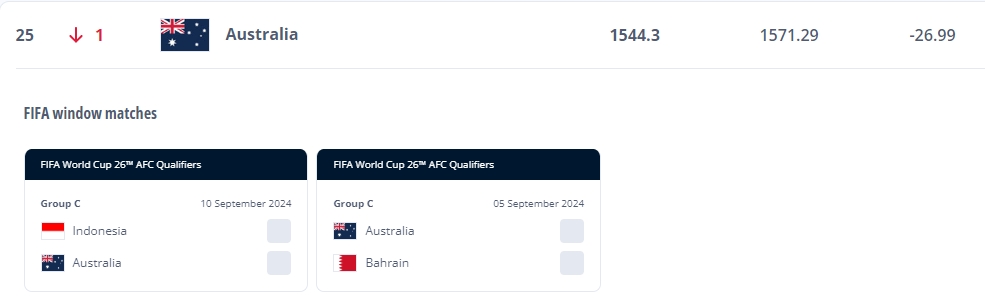 足坛汇09月19日讯 FIFA最新一期国家队排名公布,澳大利亚积分暴跌26.99分,世界排名下降1位至第25。
