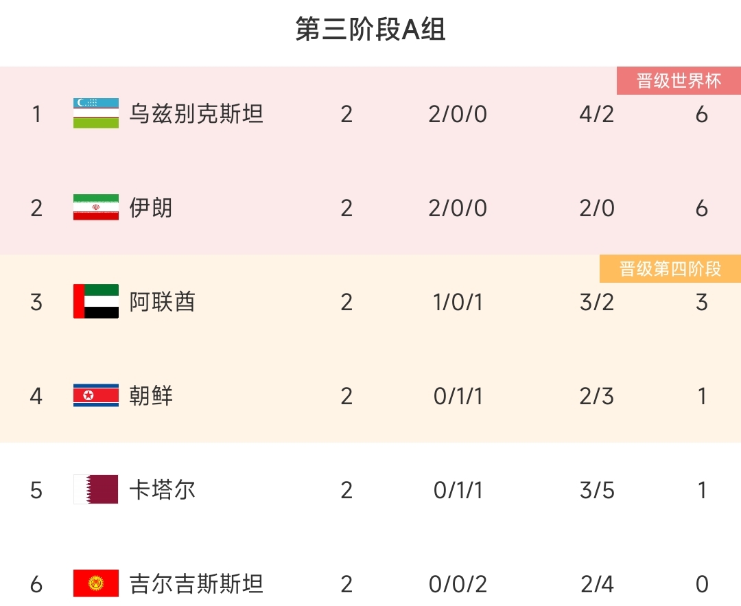 在9月份进行的2场世预赛中,卡塔尔1-3负于阿联酋,2-2被10人作战的朝鲜逼平,目前卡塔尔世预赛2战积1分,在18强赛A组中排名倒数第二。