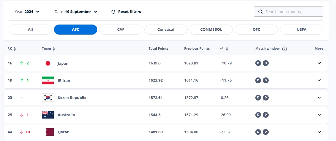 足坛汇09月19日讯 国际足联公布了最新一期的国家队排名,亚洲杯冠军卡塔尔排名下跌10位,从第34名下跌到第44名。