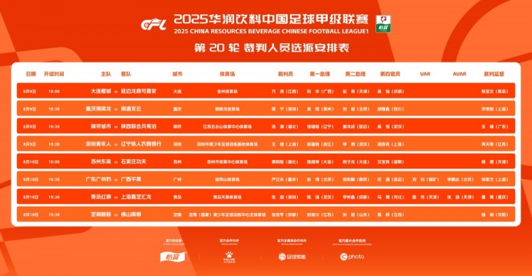 8月9日讯 中甲联赛官方公布了第20轮中甲裁判员选派名单,其中广东广州豹vs广西平果、青岛红狮vs上海嘉定汇龙这两场比赛将启用VAR。