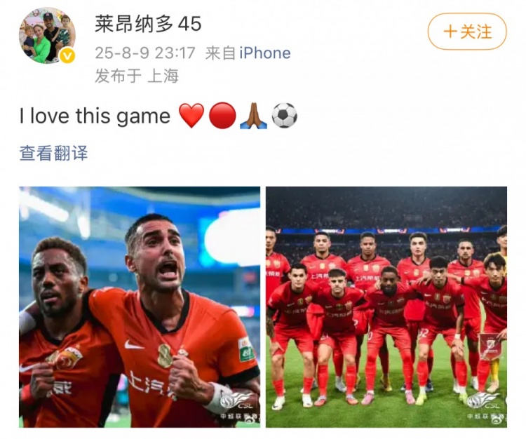 赛后为海港打入第二球的莱昂纳多更新社媒,晒出比赛照并配文写道:“我爱这项运动。”