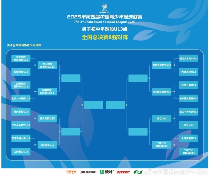 【大工附校龙卷风队U13、湖南足球青训中心U13、恒大足校U13、山东泰山U13、西南大学附中U13、长沙麓山国际U13、浙江U13、二零二八李松蓢U13晋级全国八强】2025年第四届中青赛男子初中年龄段U13组全国总决赛16进8淘汰赛赛果和8强对阵