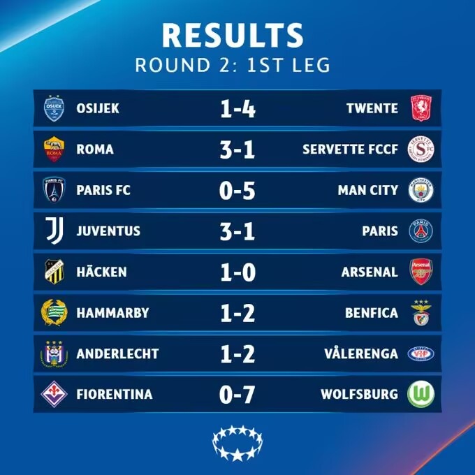 足坛汇9月19日讯 2024-25赛季女足欧冠资格赛第二轮结束首回合较量,曼城5-0巴黎FC,尤文3-1巴黎,阿森纳不敌哈肯。