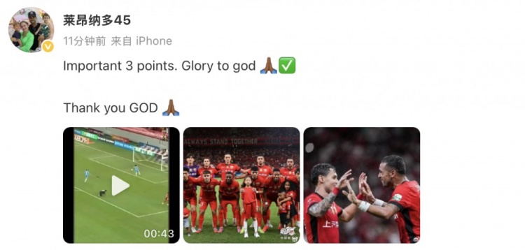 8月16日讯 海港主场4-1轻取河南队后,海港外援莱昂纳多更新社媒庆祝了这场胜利。