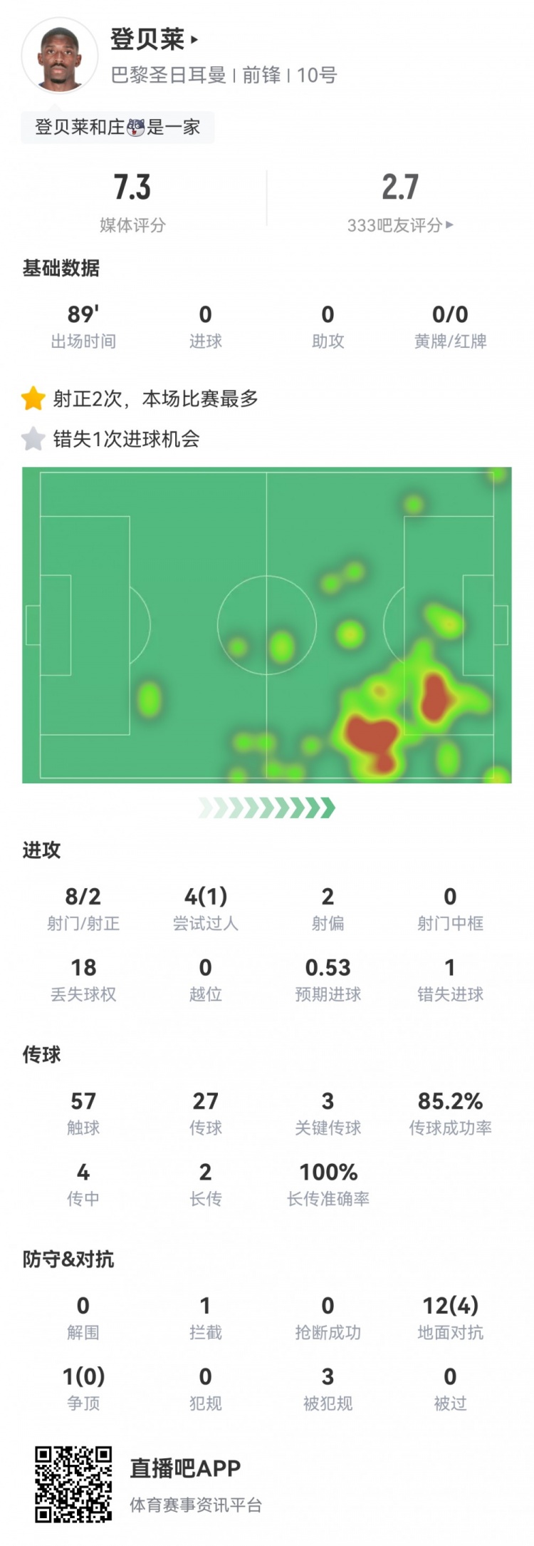 足坛汇9月19日讯 新欧冠首轮,巴黎主场1-0绝杀赫罗纳。此役登贝莱首发89分钟,球员全场重点数据如下↓