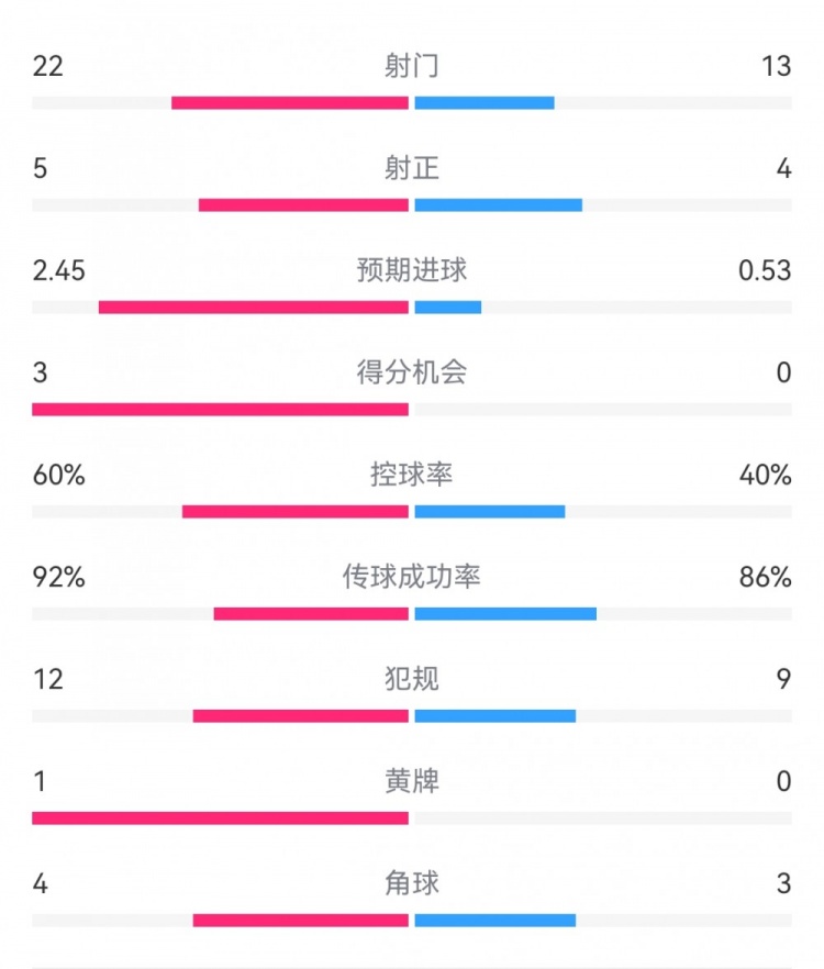 足坛汇9月19日讯 新欧冠首轮,曼城主场0-0战平国米。双方全场重点数据如下↓