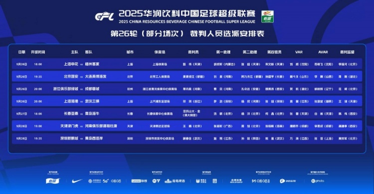 9月26日讯 中超联赛公布第26轮裁判安排,麦麦提江执法国安vs英博的比赛,与此前的报道一致,外籍裁判亚历山大-金执法亚泰vs海牛的保级大战。