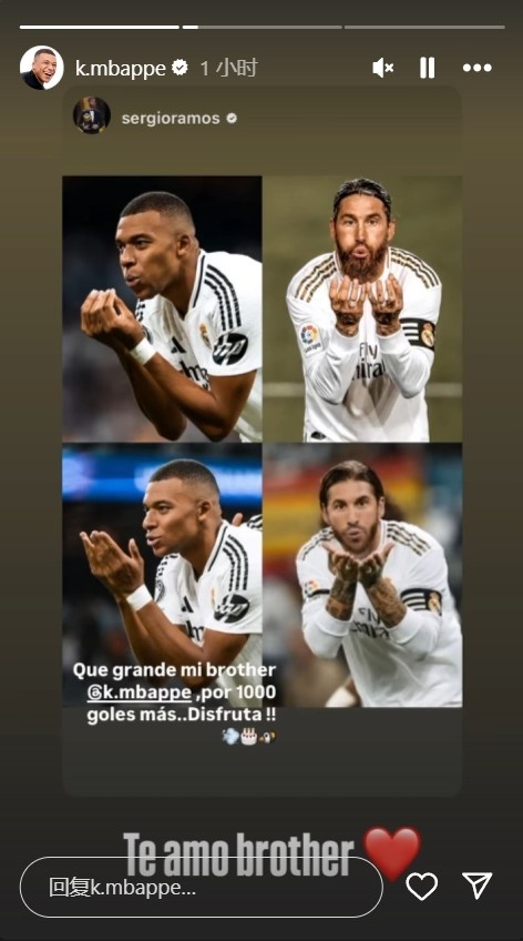 姆巴佩也是转发了拉莫斯的鼓励,并配文:爱你兄弟。