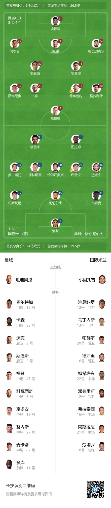 曼城首发:31-埃德森、82-刘易斯、25-阿坎吉、3-迪亚斯、24-格瓦迪奥尔、16-罗德里、17-德布劳内、20-B席、26-萨维尼奥、10-格拉利什、9-哈兰德
