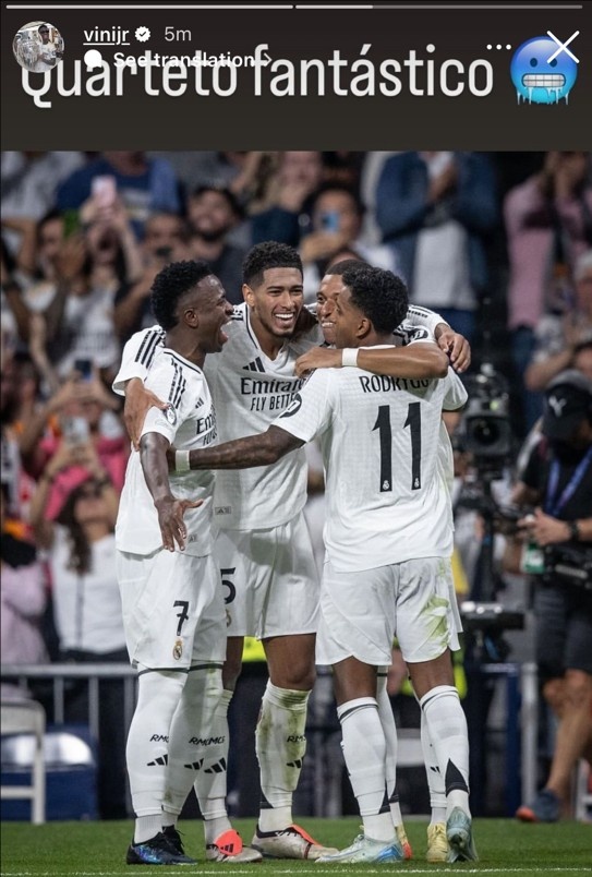 在皇马3-1击败斯图加特的比赛中,罗德里戈助攻姆巴佩打入一球,进球后罗德里戈、姆巴佩、维尼修斯以及贝林厄姆相拥庆祝。赛后,维尼修斯晒出四人合照,并配文:“梦幻四重奏”。