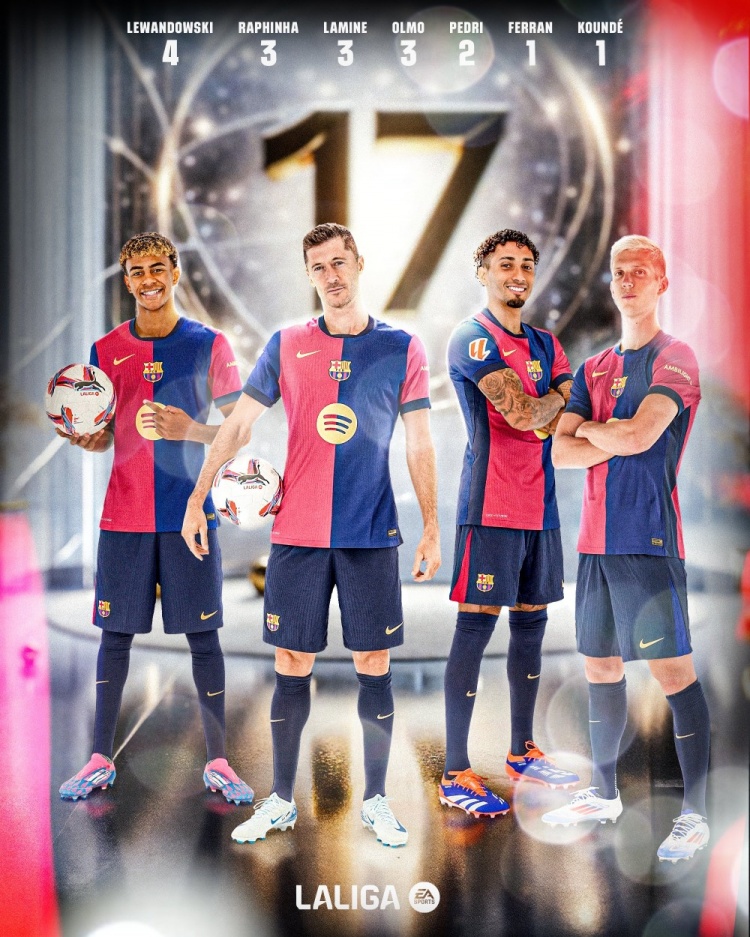足坛汇9月18日讯 西甲官方的统计,巴萨本赛季西甲前5轮打进17球,追平了队史自17/18赛季以来同轮次的最多进球纪录。