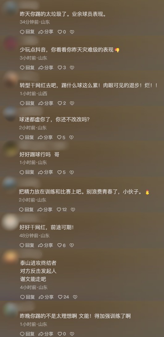 对于谢文能的近况,泰山队的球迷并不满意。有球迷直接批评他在比赛中表现不佳,也有球迷认为过多沉迷网络影响了他的状态。