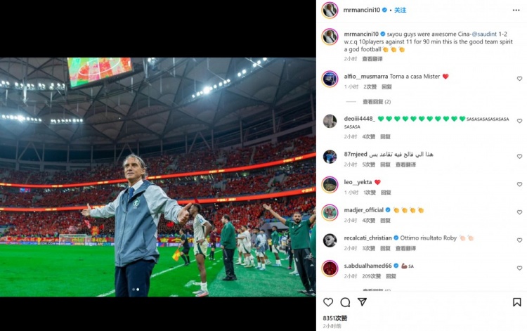 曼奇尼晒出自己在现场双手平摊的照片,表情也显得有些难以置信,并配文道:“你们真是好样的!10打11情况下最终2-1逆转中国队。这展现了出色的团队精神,踢出了很棒的足球