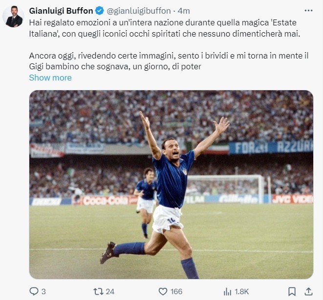 布冯表示道:在那个神奇的“意大利之夏”,你让整个国家都激动不已。你那标志性的、挥之不去的眼睛让人永远不会忘记。