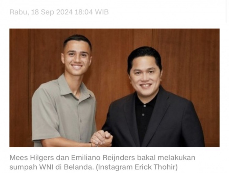足坛汇9月18日讯 据CNN印尼站报道,两名入籍球员梅斯-希尔格斯和赖因德斯将于下周一在荷兰正式宣誓成为印尼公民。