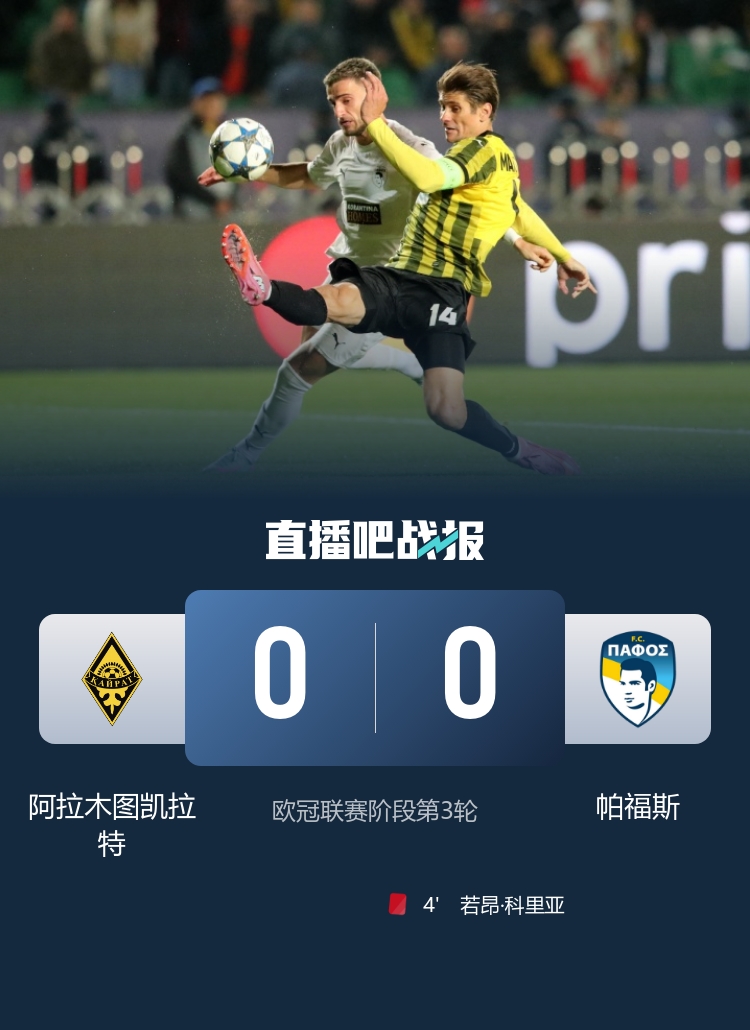 德拉戈米尔进球被吹,阿拉德射中立柱,最终阿拉木图凯拉特0-0帕福斯。