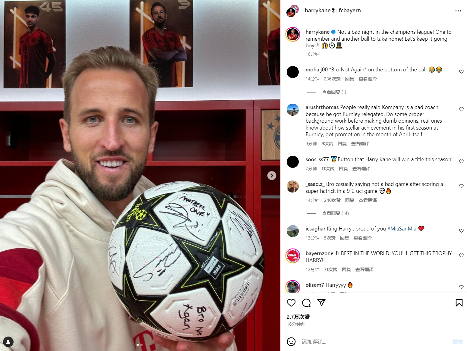 足坛汇9月18日讯 拜仁在欧冠首轮比赛9-2大胜,凯恩上演大四喜后,拿走了本场比赛的用球。