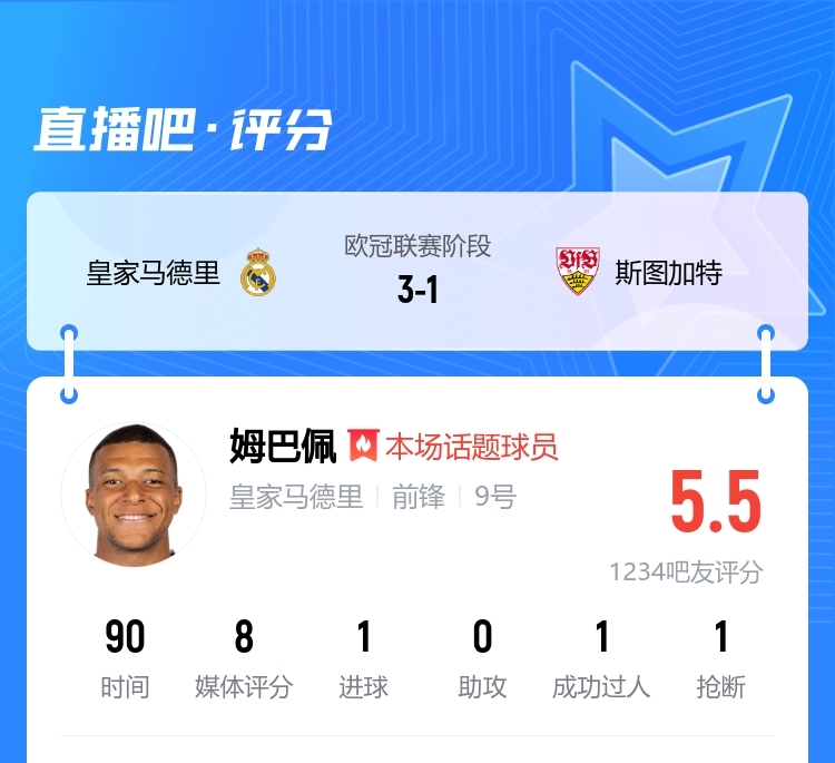 欧冠联赛阶段第一轮,皇马主场3-1战胜斯图加特。