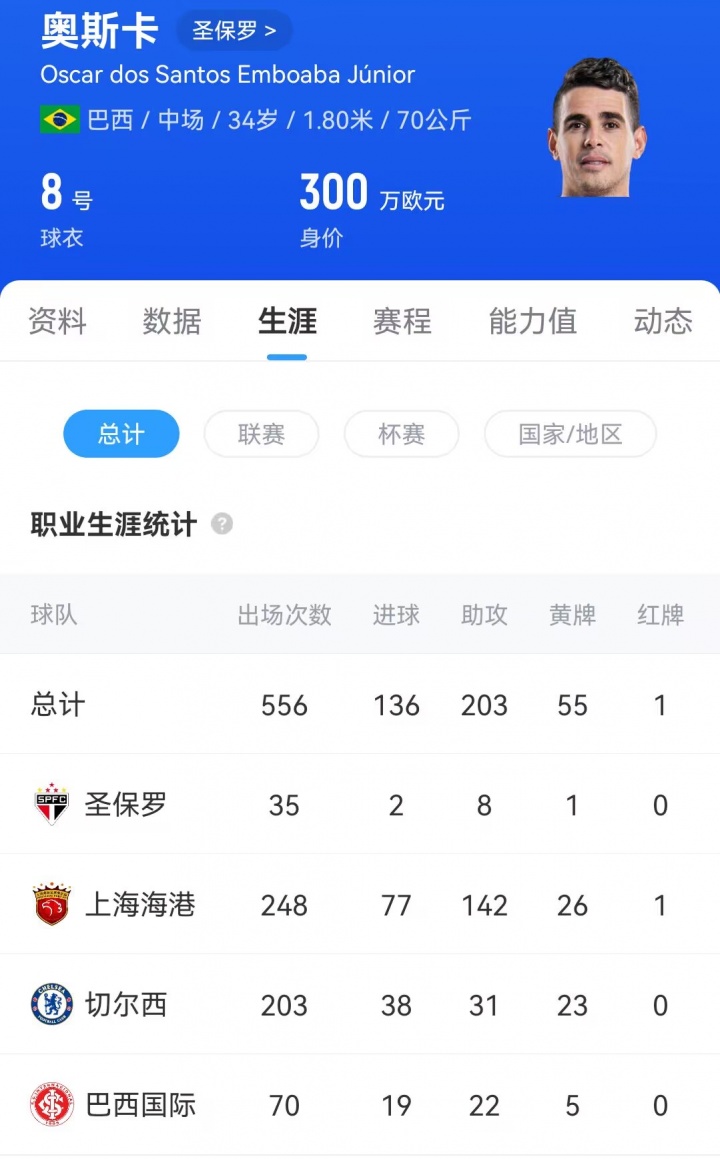 34岁的奥斯卡职业生涯曾效力巴西国际、切尔西、上海海港、圣保罗,上赛季中超结束后他自由身回到巴西,加盟圣保罗。