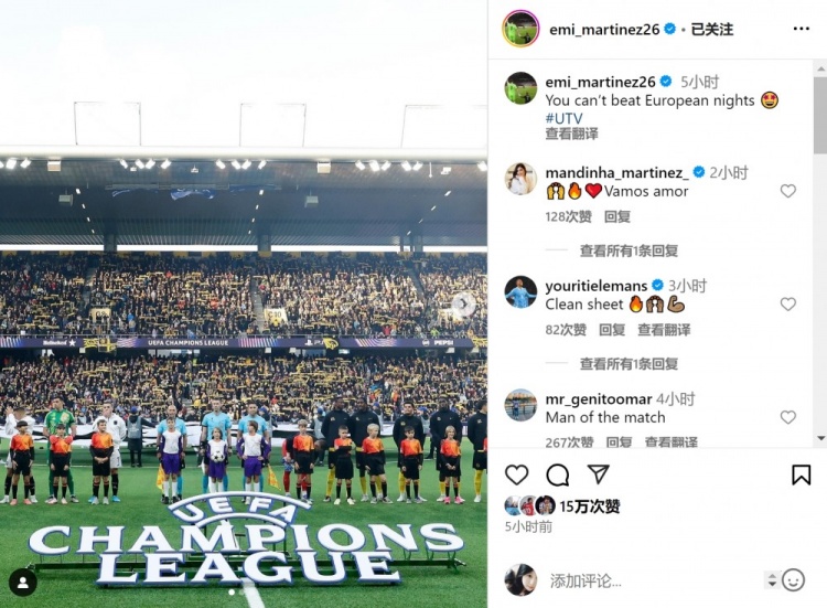 马丁内斯上一次出战欧冠比赛要追溯到2014年11月代表阿森纳对阵多特,这位阿根廷国门在社交媒体上晒出赛前列队的照片,并写道:“欧冠之夜无与伦比。”