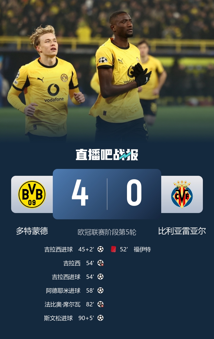吉拉西双响,阿德耶米、斯文松破门,多特4-0十人比利亚雷亚尔近四场比赛首胜。