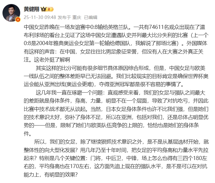 11月30日讯 中国女足友谊赛0-8惨败英格兰女足,黄健翔发文谈到了中国女足。
