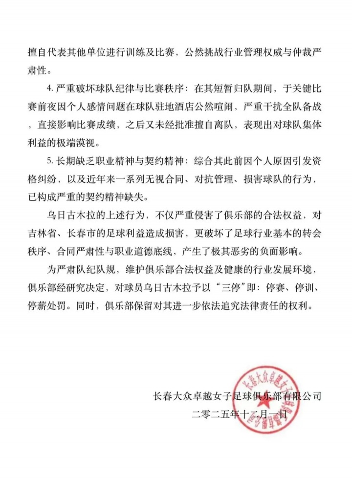 12月04日讯 女超俱乐部长春大众卓越女足发布处罚通告,女足国脚乌日古木拉被“三停”处罚,触犯5项违规违纪。