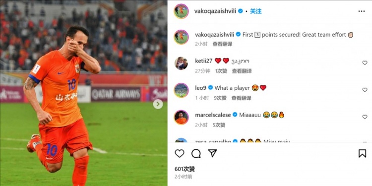 足坛汇9月18日讯 泰山外援卡扎伊什维利更新社媒,庆祝球队取得亚冠开门红。