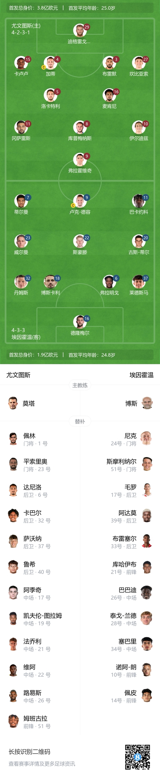 尤文首发:29-迪格雷戈里奥、15-卡卢卢、3-布雷默、4-加蒂、27-坎比亚索、5-洛卡特利、16-麦肯尼、8-库普梅纳斯、10-伊尔迪兹、11-冈萨雷斯、9-弗拉霍维奇