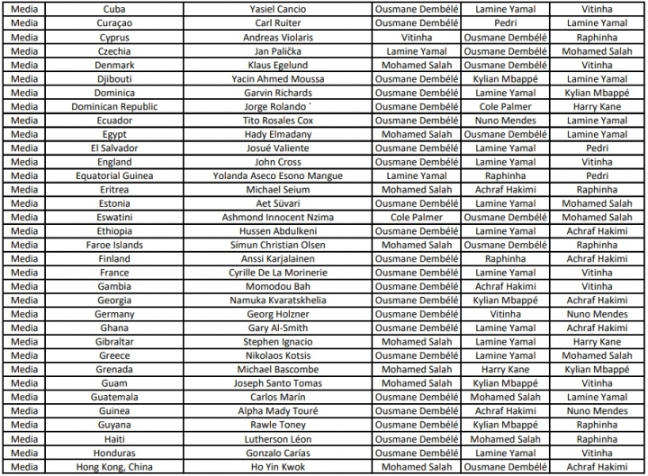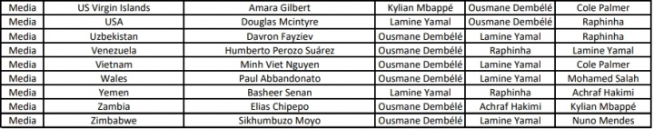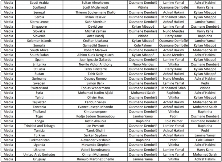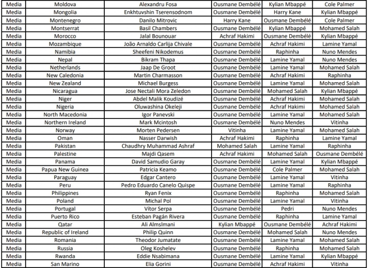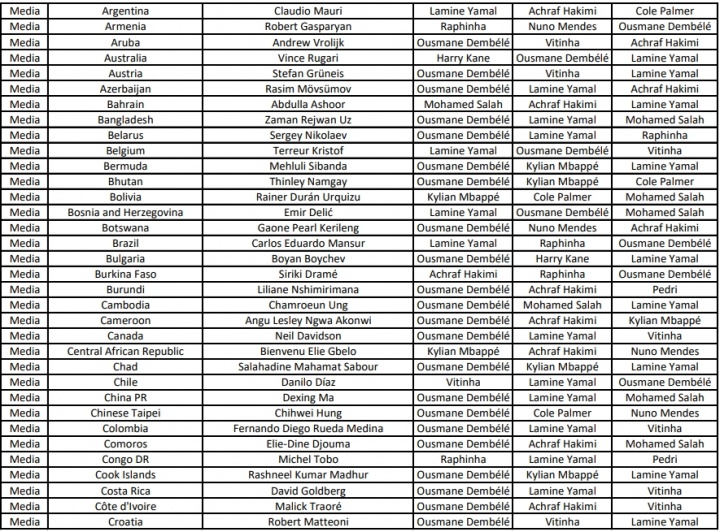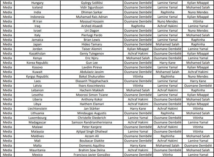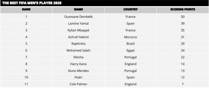 12月17日讯 FIFA年度颁奖典礼结束,登贝莱最终当选年度最佳球员(世界足球先生)。FIFA官网公布的投票详情如下,全世界的主帅+队长+媒体代表选出了他们认为的最佳球员前三名。