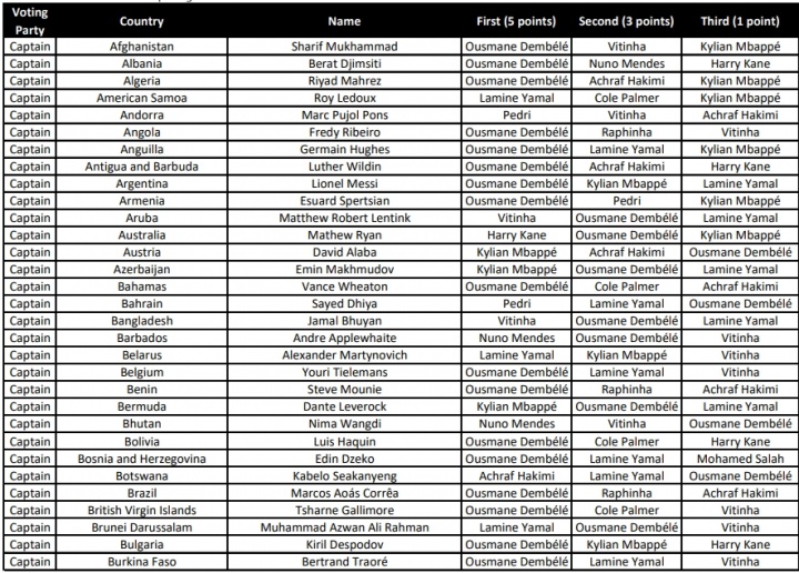 其中,阿根廷队长梅西投给了登贝莱,波兰队长莱万投给了亚马尔,中国男足队长张玉宁投给了姆巴佩,法国队长姆巴佩弃权。