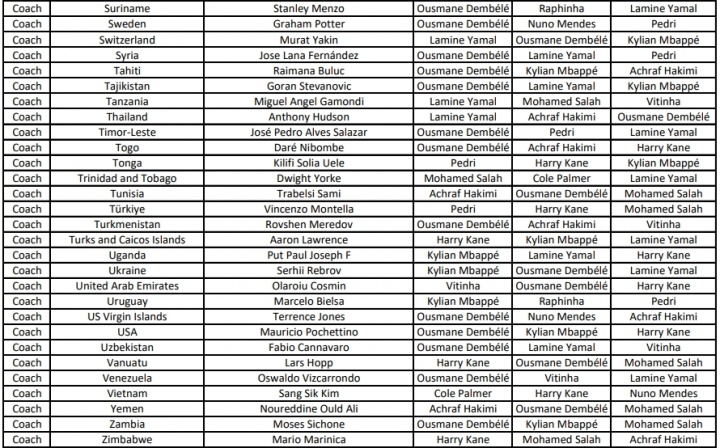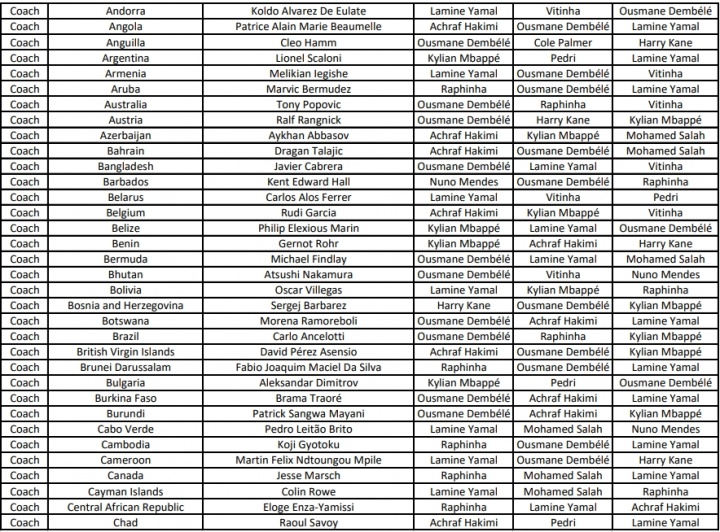 主帅投票详情:(文字顺序:国家/地区 投票人 1选 2选 3选)