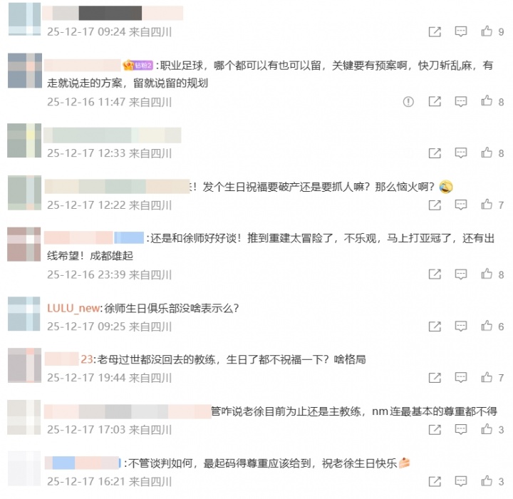 12月17日讯 今日是成都蓉城主帅徐正源生日,但俱乐部官方至今仍没有在社媒上祝他生日快乐,众多球迷在球队官博下留言,催促俱乐部发声。