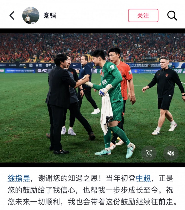 蹇韬在社媒写道:“徐指导,谢谢您的知遇之恩!当年初登中超,正是您的鼓励给了我信心,也帮我一步步成长至今。祝您未来一切顺利!我也会带着这份鼓励继续往前走。”
