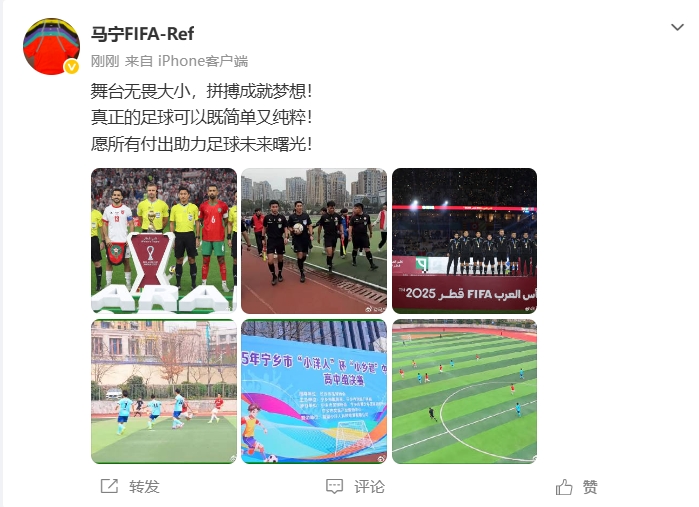 12月20日讯 马宁更新了个人社媒,晒出了执法阿拉伯杯、中小学生比赛等各类比赛的照片。