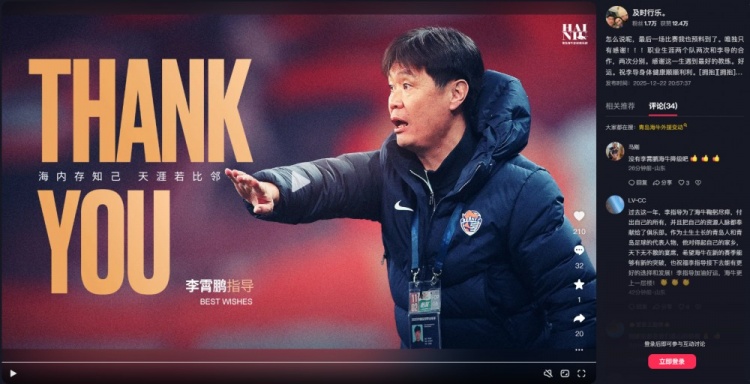 12月22日讯 2025赛季结束后,李霄鹏不再担任青岛海牛的主教练。海牛球员刘军帅今晚更新社交媒体账号,向李霄鹏表达感谢并送上祝福。