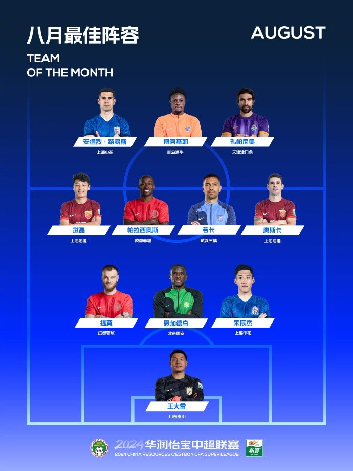 2024中超8月最佳阵容出炉,本次最佳阵容采用3-4-3阵型。最佳阵容名单如下: