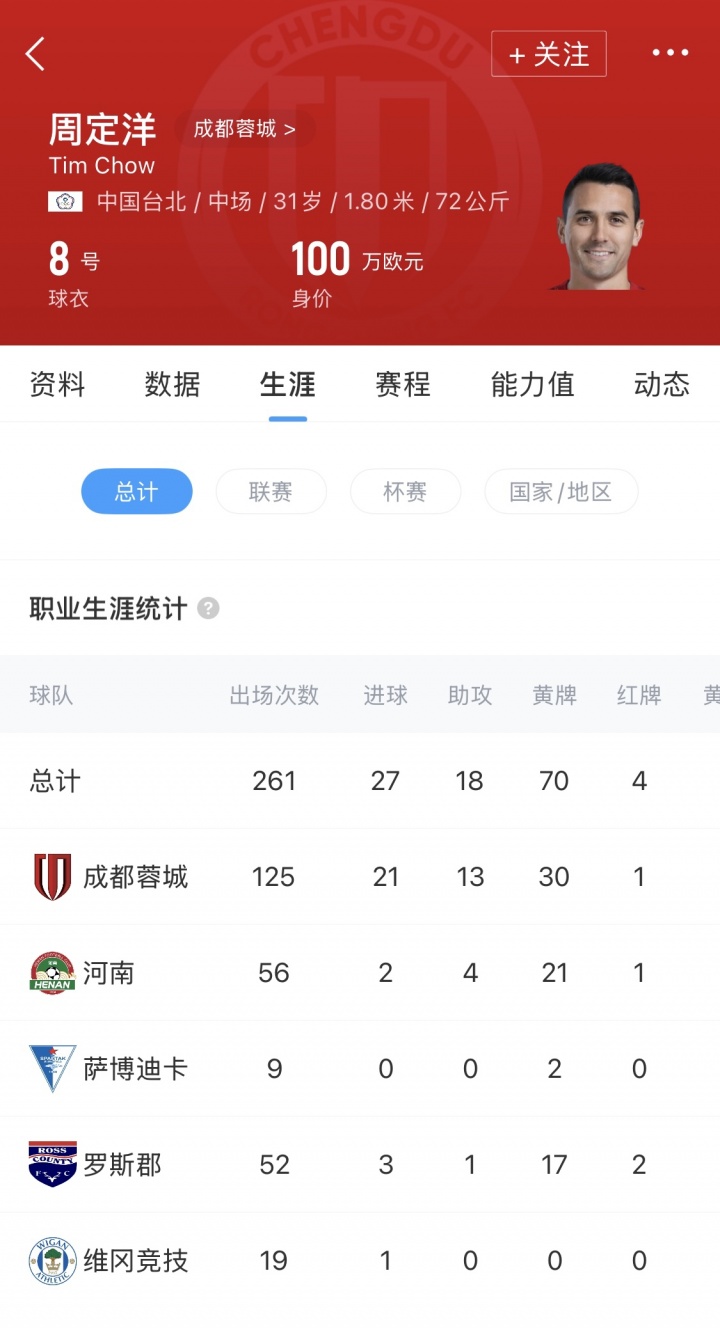 周定洋即将迎来32岁生日,他与成都蓉城的合同1月31日即将到期。2022年加盟至今,周定洋代表成都蓉城出战了125场比赛,率队完成闯入亚冠精英联赛的壮举。