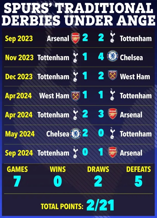 《太阳报》统计了波斯特科格鲁自2023年夏天执教热刺之后,英超中对阵阿森纳、切尔西、西汉姆3支伦敦主要的德比对手的战绩。至今英超踢了7场比赛,战绩0胜2平5负。