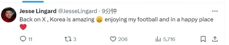 足坛汇9月17日讯 英格兰中场林加德宣布回归推特,并表示自己在韩国很快乐。