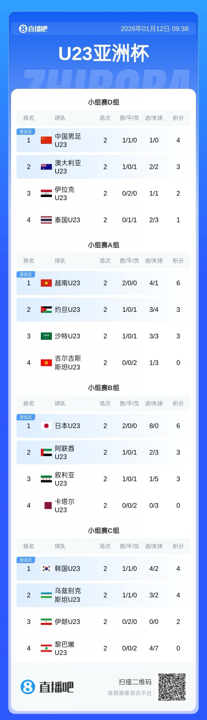 01月12日讯 U23亚洲杯小组赛已经结束了前两轮的全部争夺,目前各组的积分形势如下。