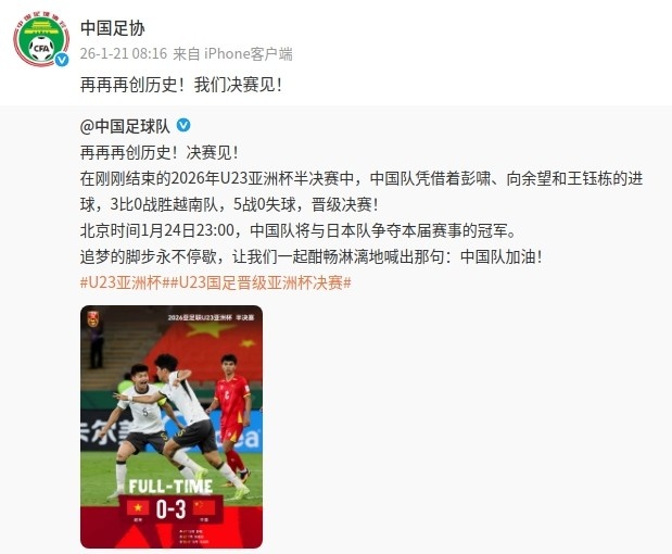 中国足协官博祝贺U23国足:再再再创历史!我们决赛见!2026-01-21
