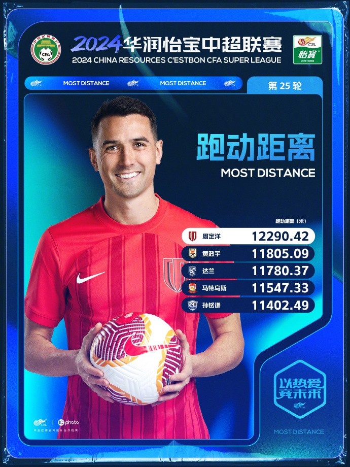 足坛汇9月16日讯 中超官方公布了第25轮跑动距离榜,成都蓉城的周定洋在本轮的跑动距离达到12290.42米,连续两轮登顶榜单,这是他本赛季第9次登顶。