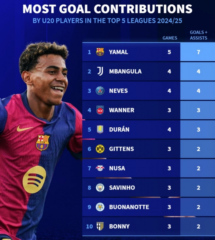 足坛汇9月16日讯 《转会市场》统计了本赛季五大联赛U20球员参与进球榜,巴萨天才亚马尔5轮造7球独自领跑。