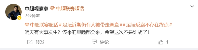 临近年关,博主“中超观察家”透露:“明天有大事发生?该来的早晚都会来,希望这次不是诈胡了”,这条内容还带有一条话题:#足坛反腐不存在终点#。