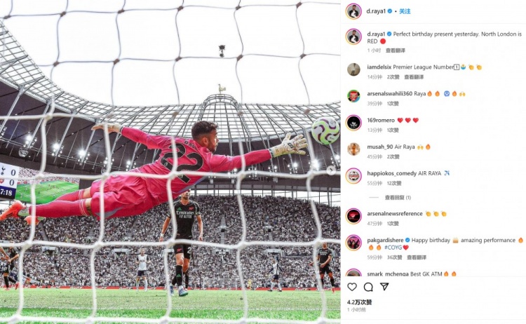 拉亚也在今日通过社媒晒出自己的扑救照,并配文:“昨天获得了完美的生日礼物,北伦敦是红色的