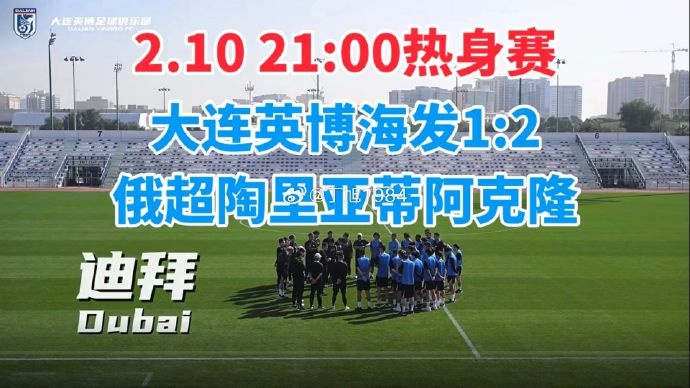 2月10日,大连英博进行了迪拜拉练的第3场热身赛,对手是俄超排名第10的陶里亚蒂阿克隆。最终,大连英博1-2失利,迪拜拉练3战全败。第4分钟,费尔南德斯率先破门,大连英博0-1。第21分钟,斯坦丘助攻,马莱莱追平比分,1-1。第54分钟,塔瓦雷斯再次将比分超出,大连英博1-2。