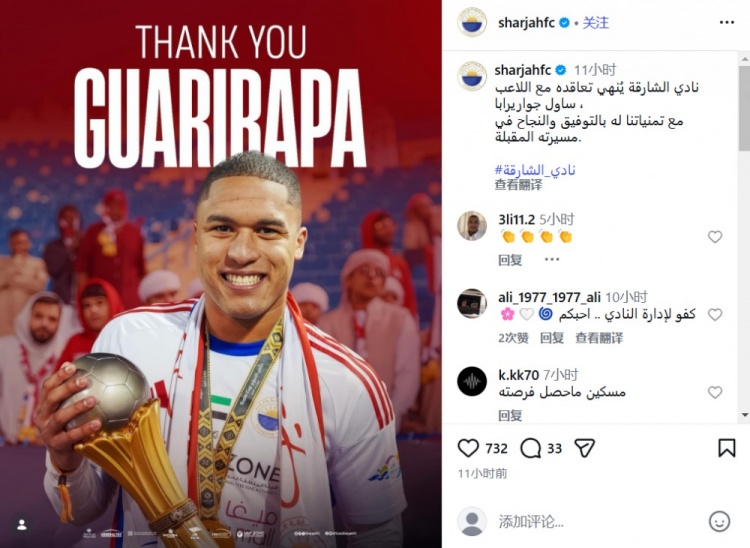 沙迦官宣终止和前锋瓜里拉帕的租借合同,据称他将加盟中超浙江队2026-02-11