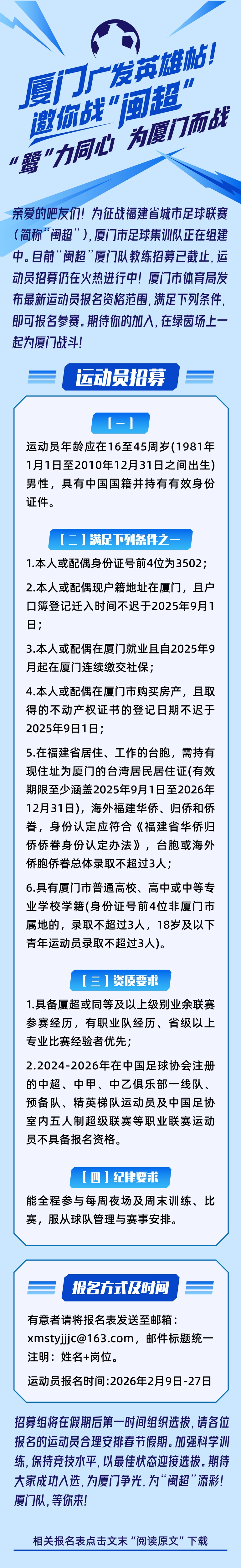阅读原文:厦门市体育局关于公开招募厦门市足球集训队教练团队及运动员的公告
